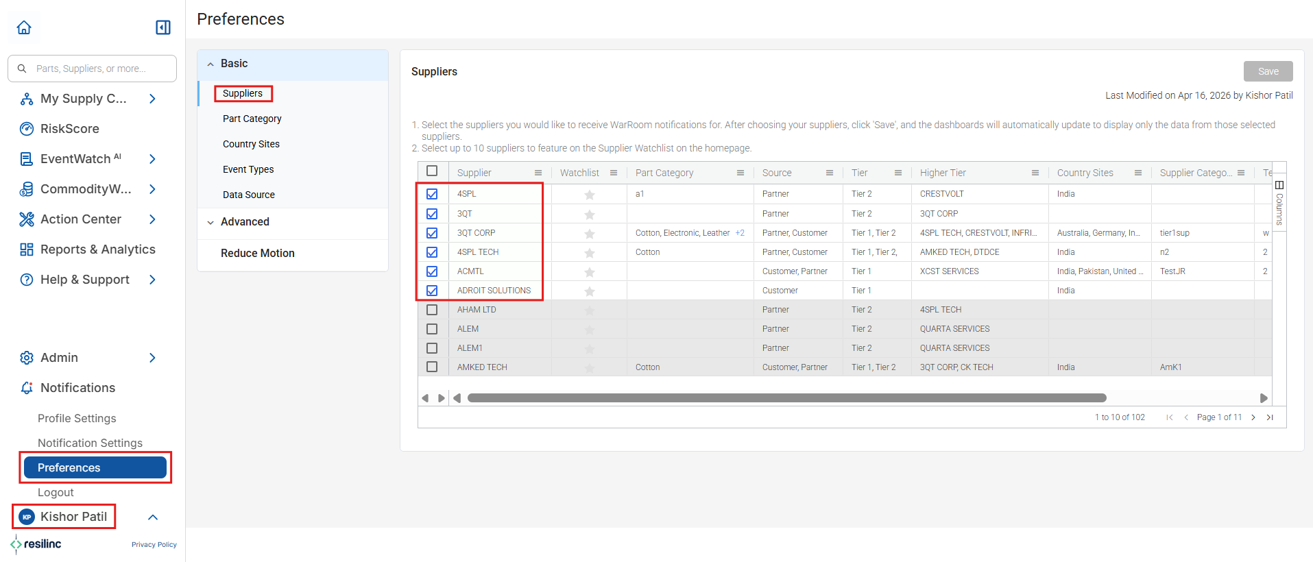 - To display suppliers on the Watchlist, the user must select the suppliers in their Personal Preferences Settings (refer to the screenshot below):