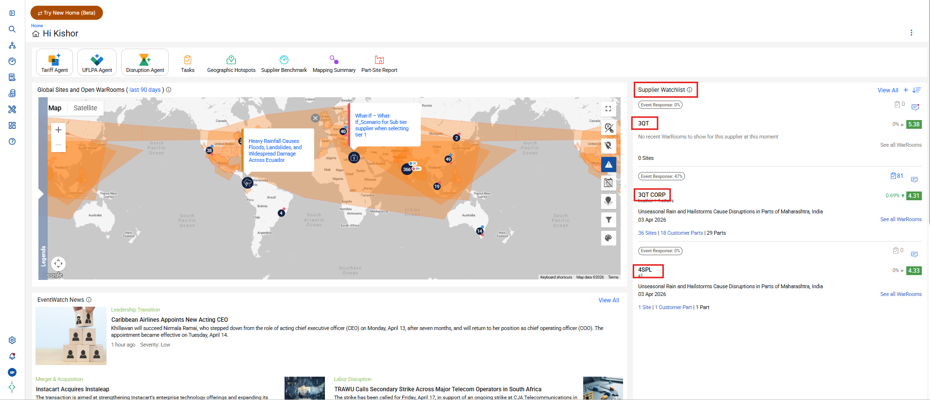 - If no suppliers are selected in the EventWatch Personal Settings, the system will display 10 suppliers in ascending order from the entire supplier list.