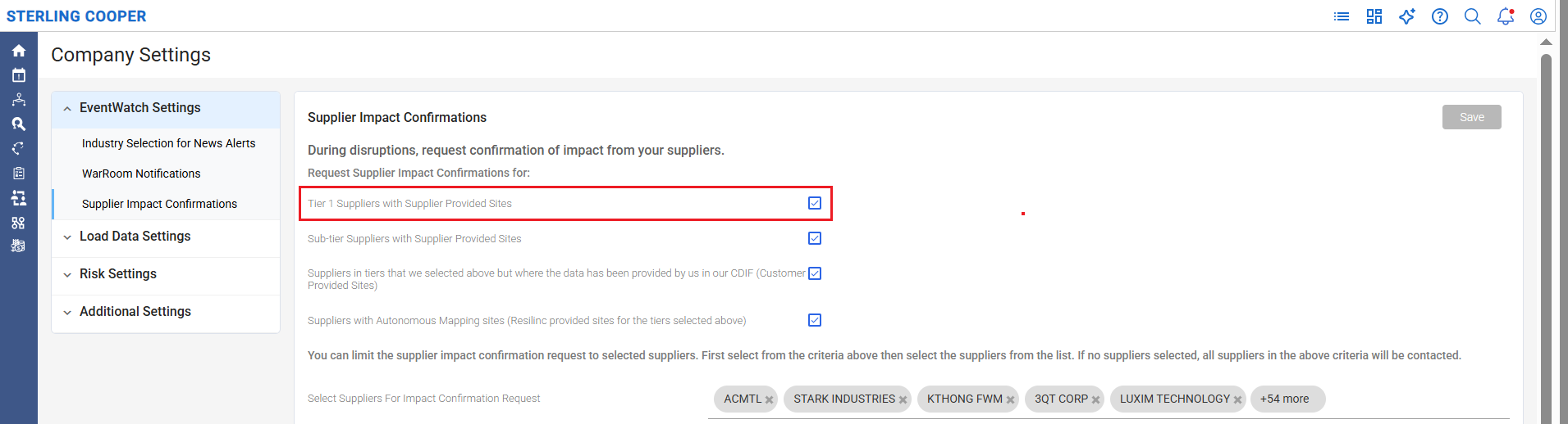 - If the 'Select Partners for Impact Confirmation Request' option is not visible on the settings page, it likely means that the 'Tier 1 Suppliers with Supplier Provided Sites' setting has not been enabled.