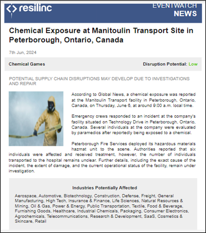- The EventWatch news notification email includes a section titled 'Industries Potentially Affected'.