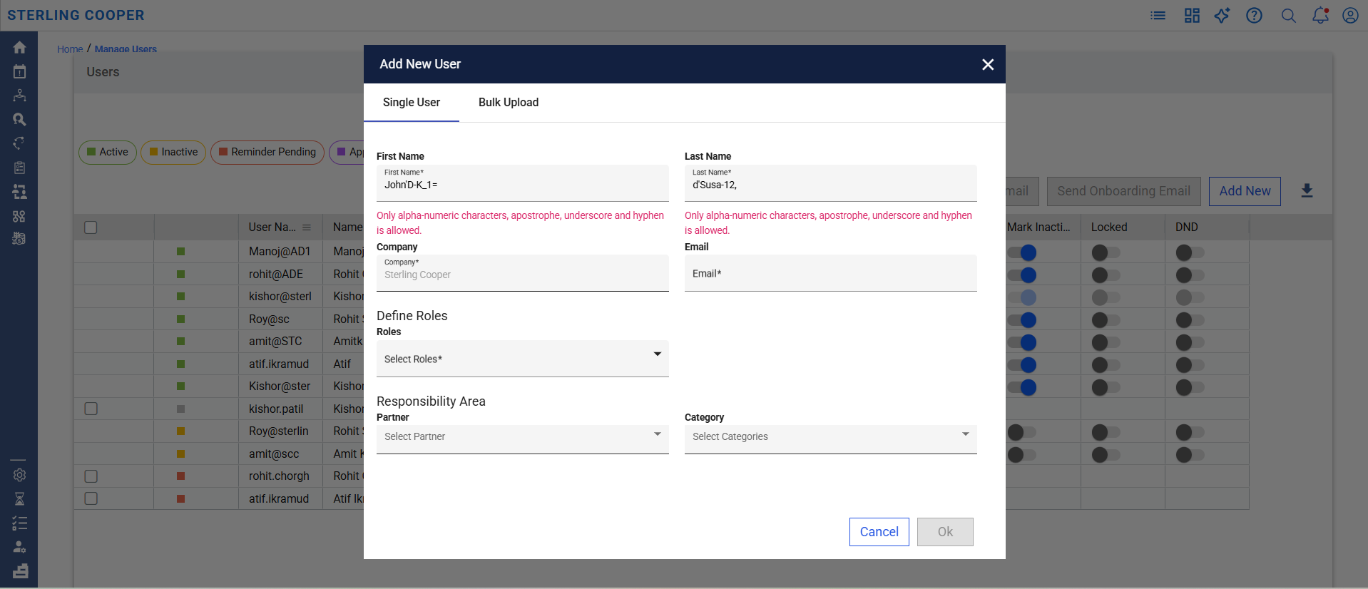 Use of invalid characters will block user creation and display an error message.