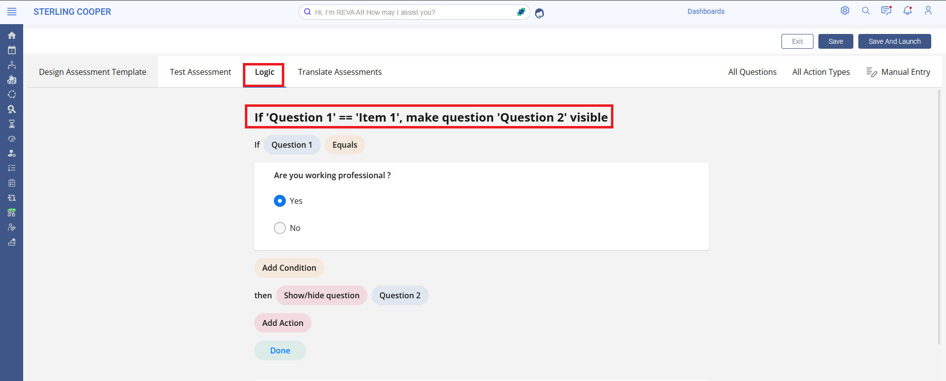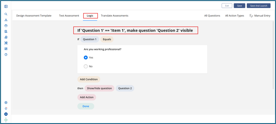 - In many assessments, conditional logic is applied to control the flow of questions. One common logic is the use of the "VISIBLE IF" condition on certain questions. Refer screen-print showing the question is configured with Visible If conditional logic: