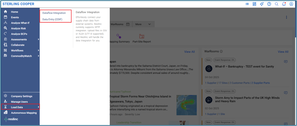 - To load or map data, go to the Administration menu in the left sidebar and select "Load Data." Here, you will find options for uploading files, integrating data using Dataflow Integration, or performing direct data entry (CDIF).