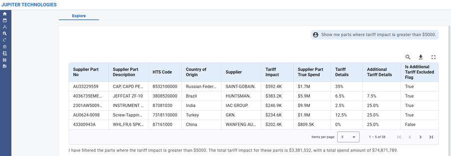 “I have filtered parts where the tariff impact is greater than $5,000. The total tariff for these parts is $3.3M with a total spend of $74,871,789.” - This enables teams to quickly identify and prioritize high-impact items for mitigation.