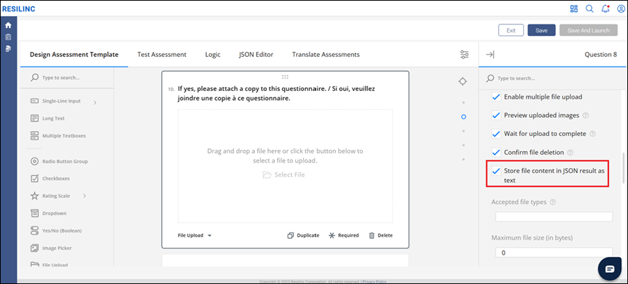 “Store file content in JSON result as text.” - Save the assessment template.